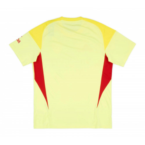 Футболка представлена в яркой жёлтой палитре с плавным градиентом и акцентами в красных тонах. Контрастные полосы на плечах и боковые вставки создают динамичный образ, а герб «Арсенала» и логотипы спонсоров на груди подчёркивают клубную символику. Модель выполнена из технологичной спортивной ткани, которая обеспечивает вентиляцию и комфорт даже при высокой нагрузке. Удобный крой не сковывает движений, что особенно важно для вратарской экипировки. Футболка станет отличным выбором для тренировок, матчей или коллекции болельщика, который хочет поддерживать «Арсенал» в самых ярких цветах