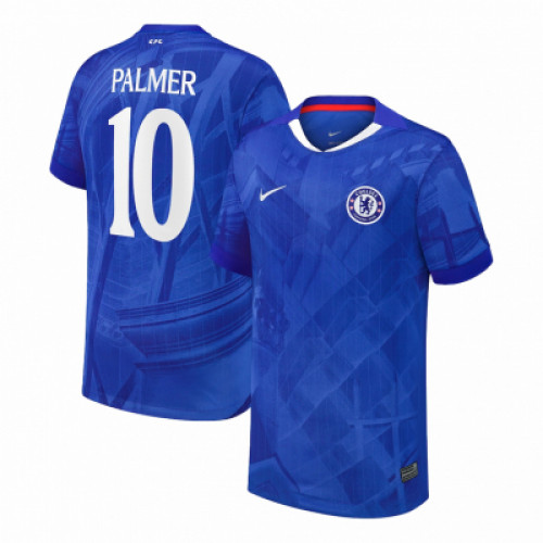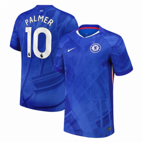 Домашняя джерси Chelsea сезона 2025/26 с персонализацией: PALMER 10 на спине. Насыщенный синий цвет с графичным узором тон-в-тон, белые логотипы Nike и эмблема клуба на груди. Круглый ворот с белой окантовкой и красным акцентом внутри — аккуратная деталь. Отлично для матчей и повседневного спорта.