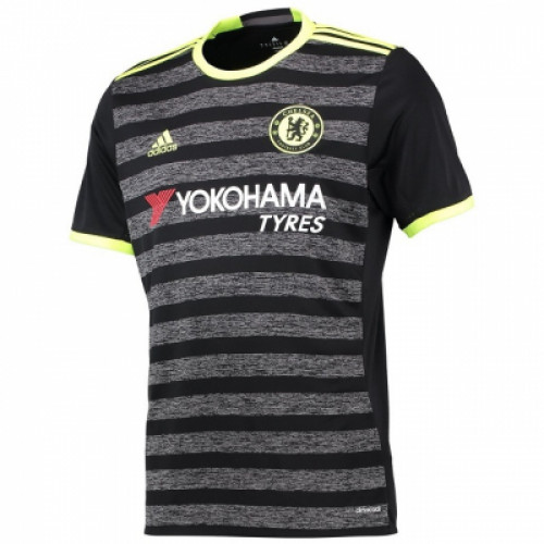 Chelsea (гостевая, ретро 2016/17): чёрная футболка adidas с серыми горизонтальными «меланж»-полосами и неоново-жёлтой окантовкой воротника и рукавов. На груди — жёлтый герб Chelsea и логотип adidas, спереди крупный спонсор Yokohama Tyres. Лаконичный, контрастный дизайн с яркими акцентами.
