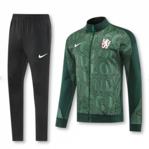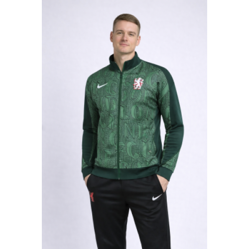Спортивный костюм Chelsea 25/26: чёрные зауженные брюки и зелёная олимпийка на молнии. Верх с графическим принтом из крупных буквенных элементов, логотипом Nike и клубным шевроном Chelsea на груди. Практичный комплект для тренировок и повседневной носки: лёгкий, аккуратная посадка, контраст «чёрный низ + акцентный верх».