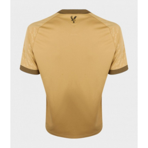 Кристал Пэлас футболка резервная 2025/26 Резервная футболка «Кристал Пэлас» сезона 2025/26 выполнена в изысканном золотистом оттенке с тонким геометрическим узором по ткани, что придаёт форме стильный и современный вид. Чёрные детали на манжетах и воротнике создают аккуратный контраст и подчёркивают премиальный характер дизайна. На груди расположен клубный герб в минималистичном чёрном варианте, логотип производителя и спонсорская надпись NET88, а на спине под воротником — эмблема «орлов», придающая дополнительную идентичность экипировке. Футболка выполнена из лёгкого технологичного материала, который обеспечивает отличную вентиляцию, комфорт и свободу движений как во время матча, так и при повседневной носке. Эта модель — элегантная альтернатива основной форме, идеально подходящая для болельщиков, которые хотят выделяться и оставаться верными «Кристал Пэлас».