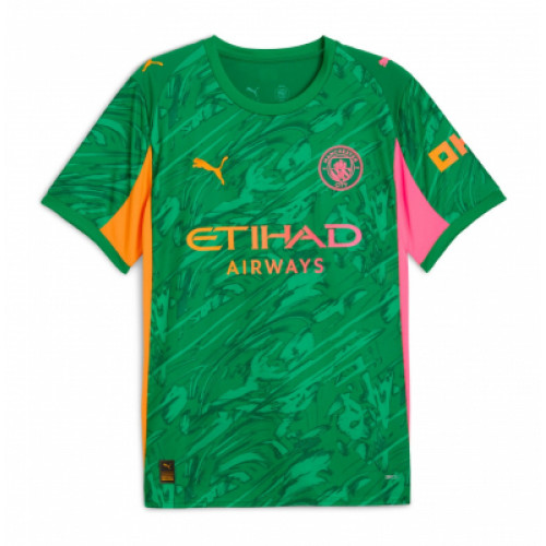 Манчестер Сити футболка вратарская 2025/26 Вратарская футболка «Манчестер Сити» сезона 2025/26 выделяется ярким и смелым дизайном. Основной зелёный фон дополнен динамичным абстрактным рисунком, создающим эффект движения и энергии. Контрастные розовые и оранжевые вставки на рукавах добавляют дерзкий акцент и подчёркивают уникальность формы. Модель выполнена из высокотехнологичного материала Puma с системой отвода влаги DryCell, что обеспечивает комфорт, вентиляцию и свободу движений в любых игровых условиях. На груди размещены логотип Puma, клубный герб и спонсор Etihad Airways в ярких оттенках, усиливающих эффектность образа. Это не просто экипировка, а символ уверенности и яркого стиля вратаря, который всегда остаётся в центре внимания на поле.