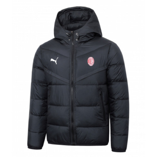 Куртка утепленная ФК Милан. Сезона 2023-2024. Выполнена в чёрном цвете с бело-красными эмблемами. С капюшоном, на длинной молнии. На карманах молнии. На груди эмблема клуба.