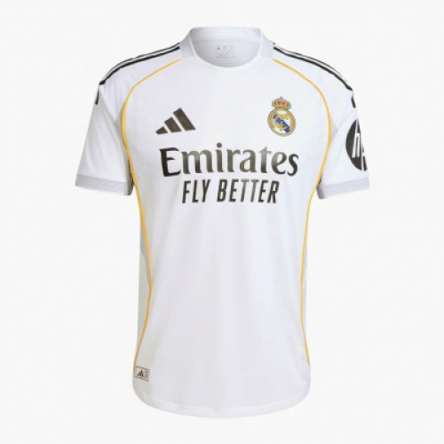 Игровая версия домашней формы Реал Мадрид сезона 2025/26 — это максимум классики и статуса. Чистый фирменный белый цвет, чёрные полосы на плечах и аккуратные золотые акценты по корпусу — минимализм, который всегда работает. Ничего лишнего. Только узнаваемость, история и характер. Это именно ИГРОВАЯ версия — та, в которой выходят на поле. Облегчённая технологичная ткань, улучшенная вентиляция, анатомическая посадка по фигуре. Лёгкая, эластичная, комфортная в движении. Посадка более приталенная по сравнению с фанатской версией — учитывайте это при выборе размера.